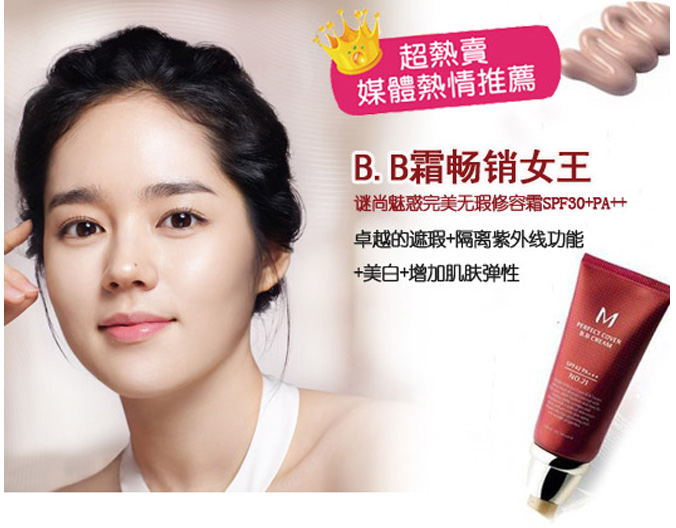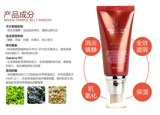 无需另外使用防晒霜,并且具有美白、改善皱纹等功效,为四重功效BB霜,可有效预防老化。有效护理瑕疵与红血丝,演绎均衡、柔美肌肤。